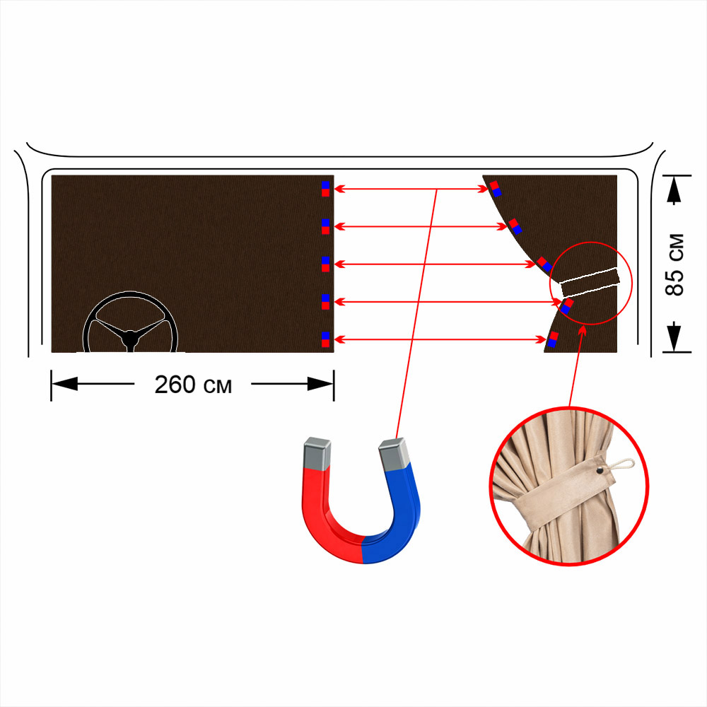 Шторы лобового окна 2,6*85 без бахромы на магнитах (Блэкаут Коричневый)